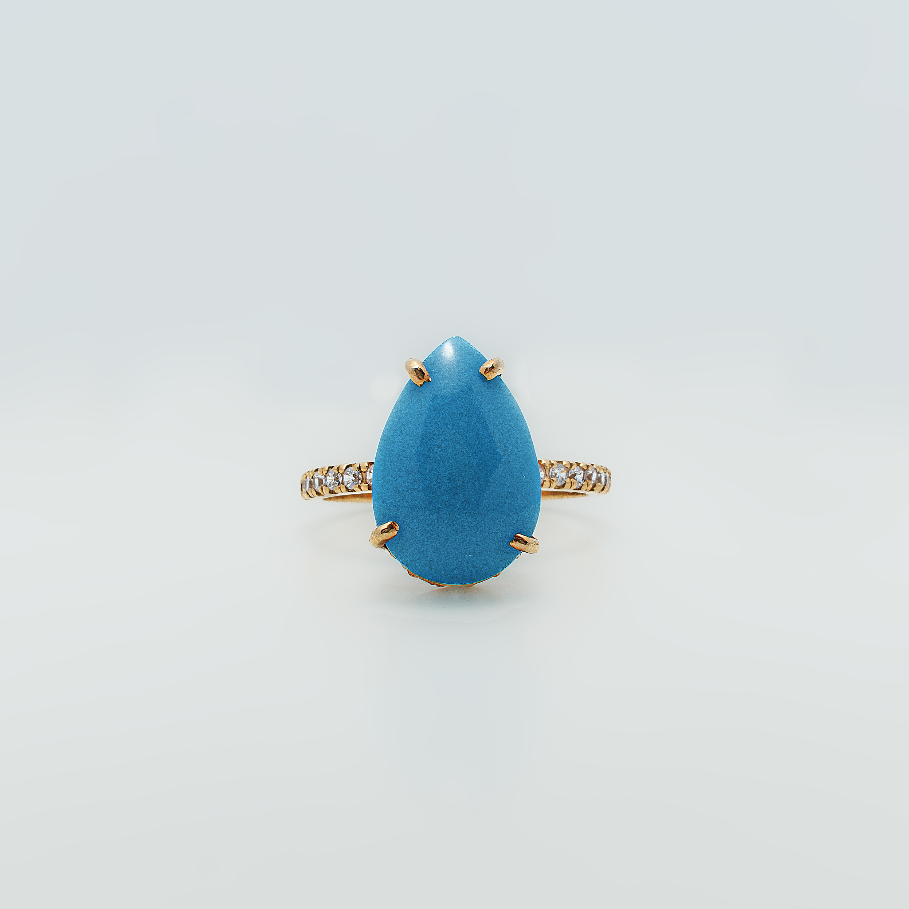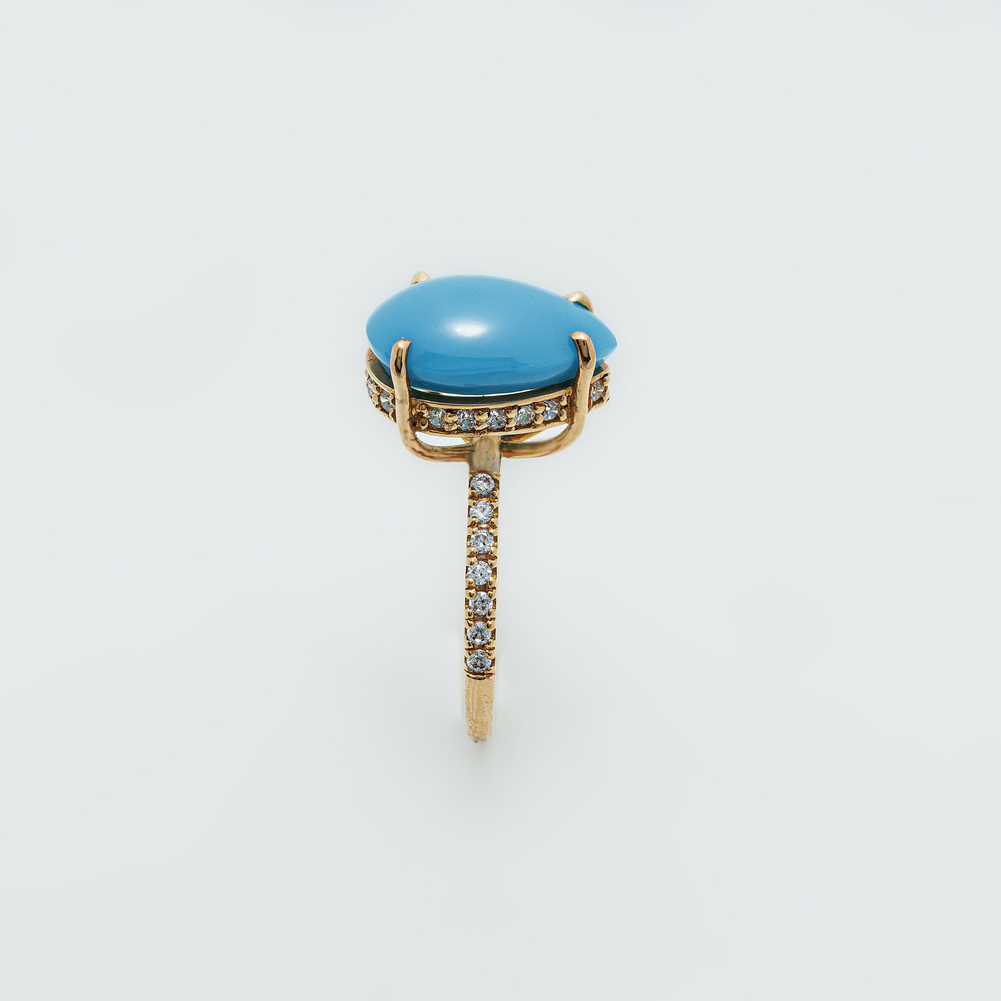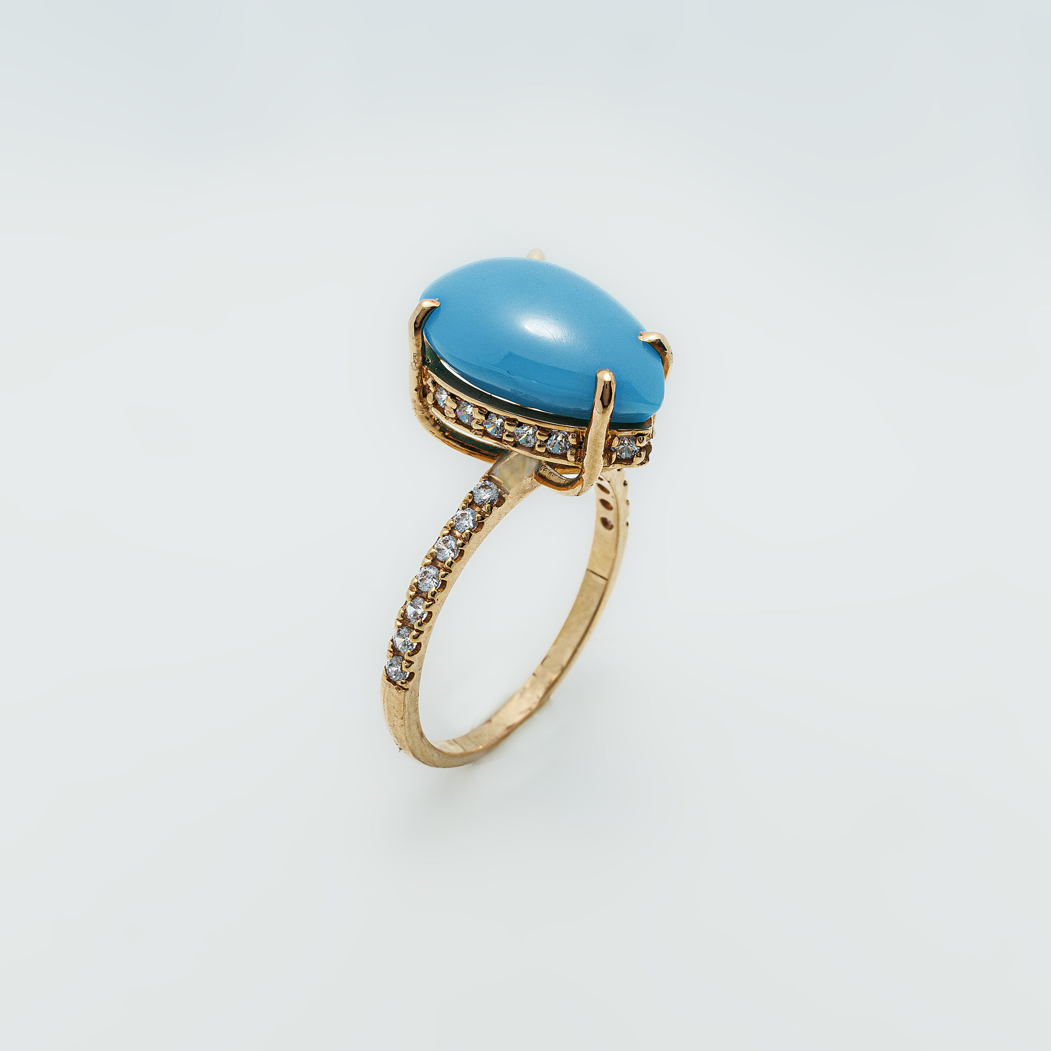 Featuring a smooth, natural turquoise stone in a high-set gold-toned prong setting, this ring is accented with a delicate band of sparkling zircons. A graceful balance of color and shimmer, perfect for a refined statement.
