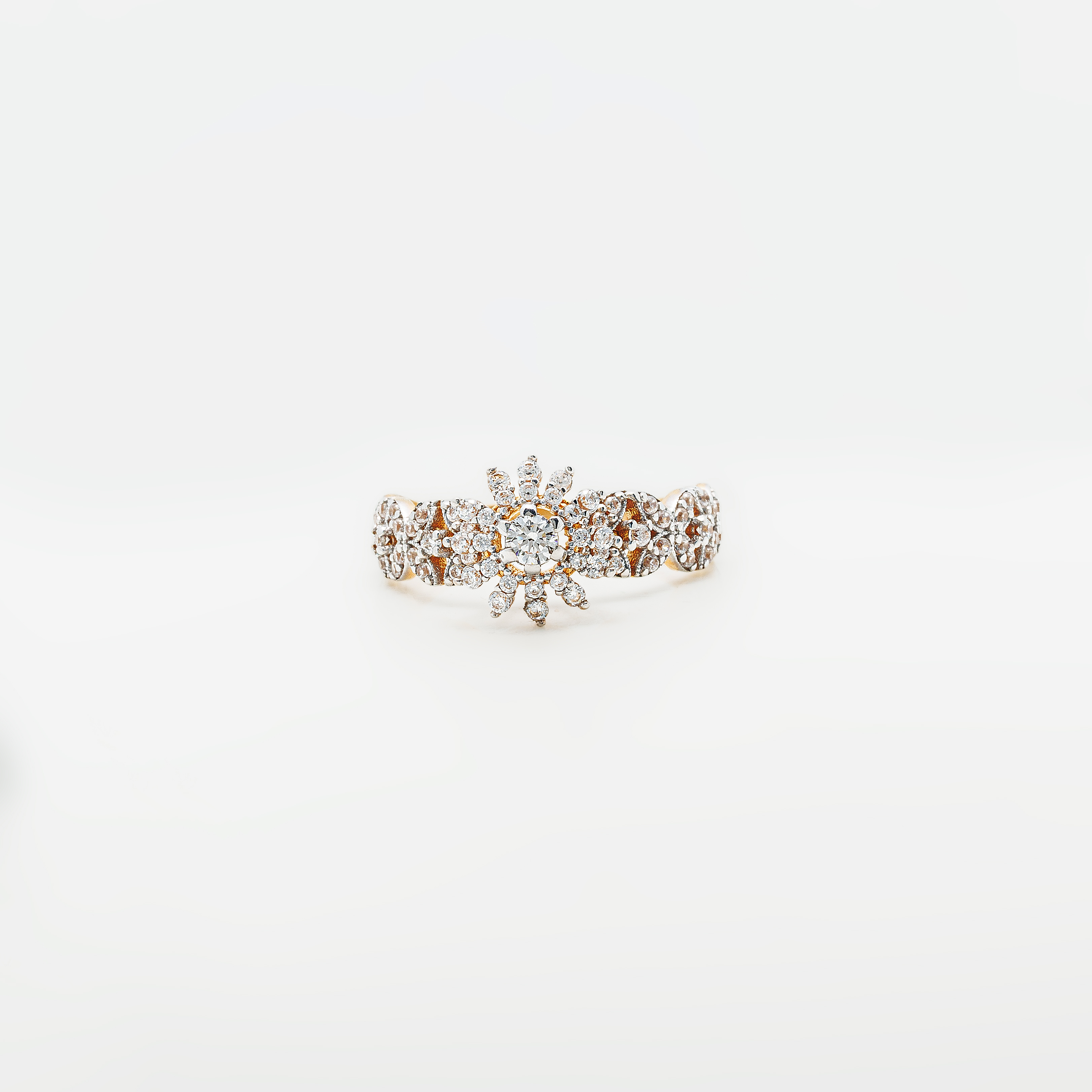 A beautifully crafted 21K gold ring adorned with sparkling zircon stones in a raised cluster setting. The detailed band adds extra brilliance and elegance, making this ring a graceful choice for formal wear, gifting, or special occasions.