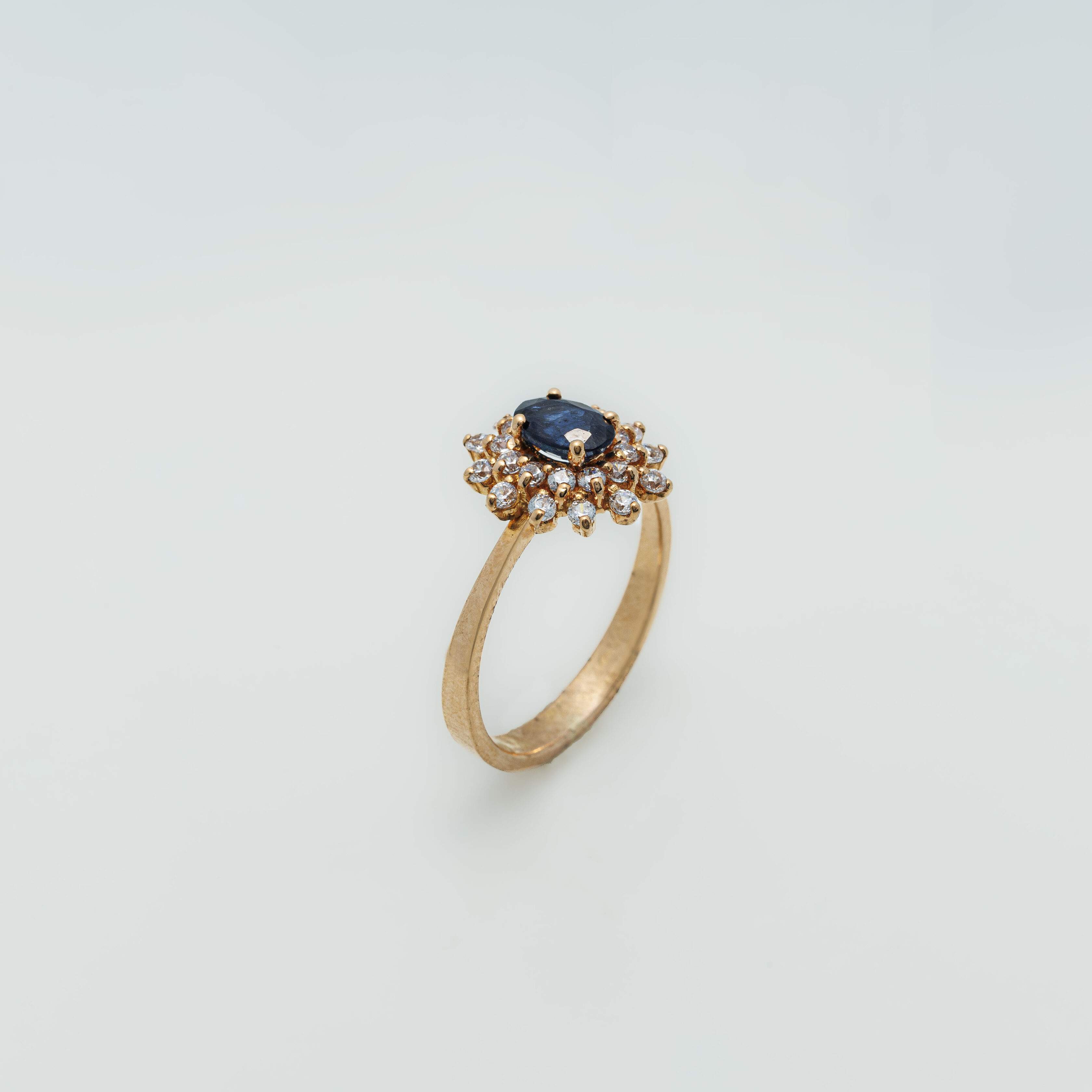 A stunning 21K gold ring adorned with a vivid blue sapphire at its heart, encircled by shimmering white zircons. Its floral-inspired design adds a touch of timeless elegance, perfect for both everyday wear and special occasions.