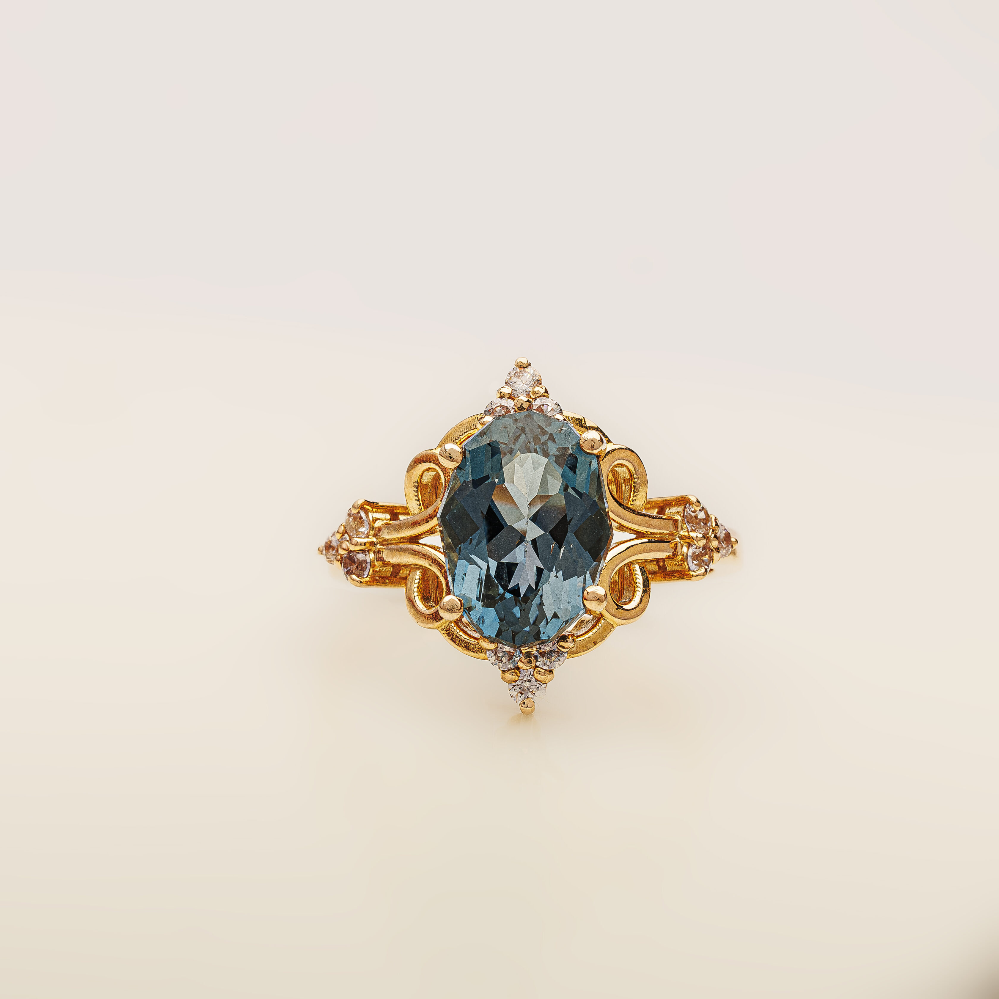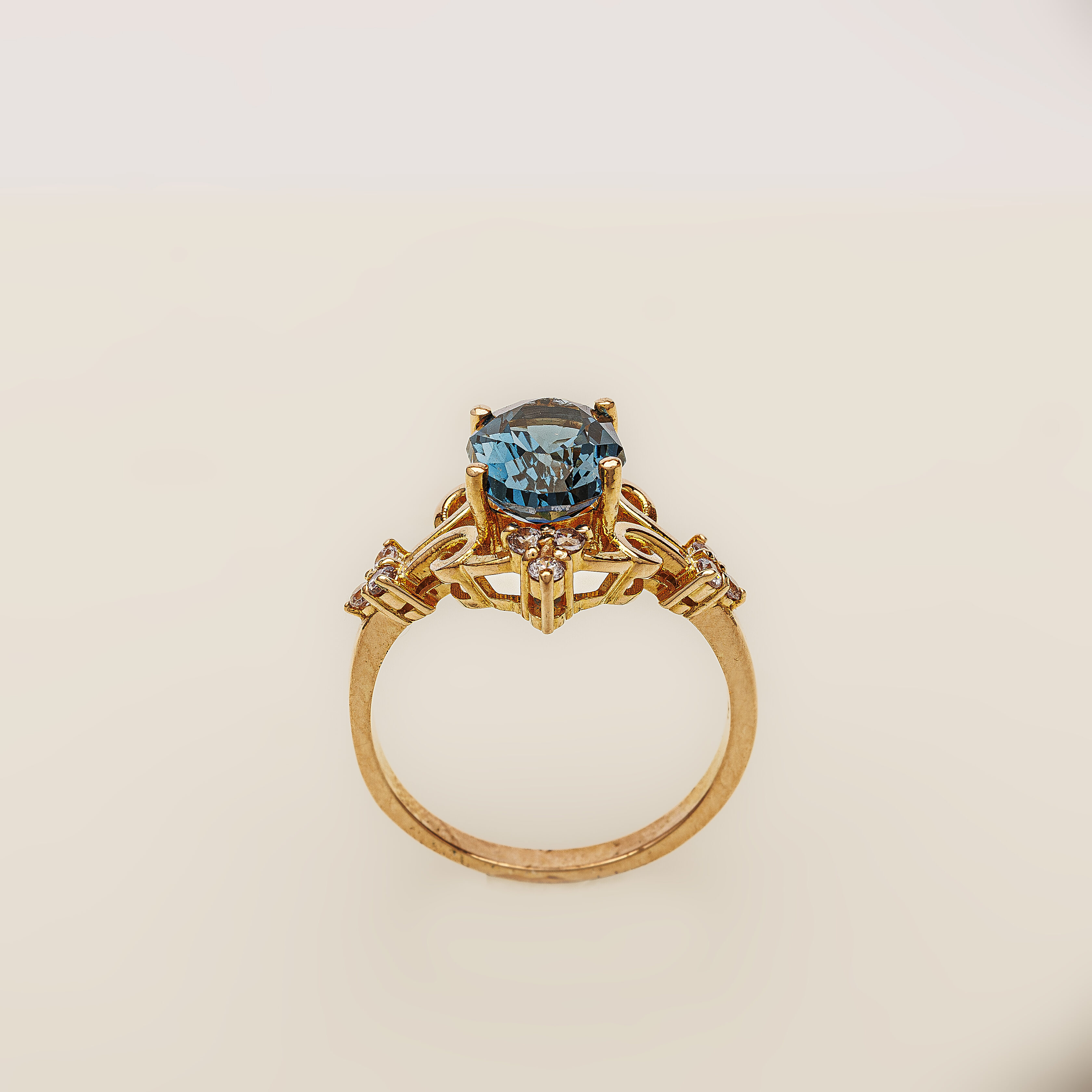 A regal statement of sophistication — this exquisite ring features a richly hued London Blue Topaz at its center, masterfully set in 21k gold. The ornate setting is adorned with shimmering zircon accents, enhancing the luxurious appeal. A perfect blend of elegance and craftsmanship, ideal for those who appreciate refined beauty with a bold touch.